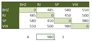Do Rio de Janeiro (SEGUNDA LINHA DA MATRIZ) até São Paulo (TERCEIRA COLUNA DA MATRIZ), por exemplo, temos 450 quilômetros, conforme a tabela. (MATRIZ; 2; 3)