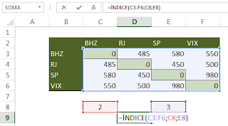 Alterem o número da linha e da coluna desejadas para quaisquer outros valores , desde que válidos (1 a 4), e vejam que a distância exibida é exatamente o cruzamento da linha X com a coluna Y.